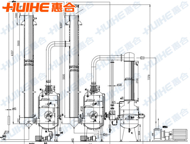 1, the material is by the column tube into the upper and the material distribution device evenly into each root canal and form a thin film along the tube surface. By dividing wall heat transfer, material to boiling, boiling gas drive liquid high-speed flow down, into the vapors liquid separator, the product is able to concentrate.