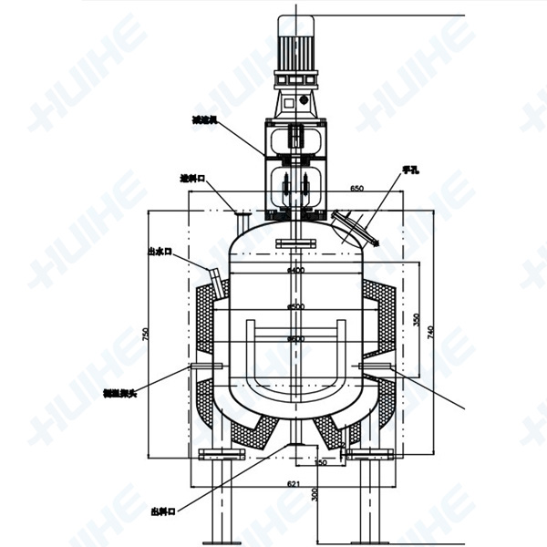 該反應設備主要由鍋體、鍋蓋、攪拌器、夾套、支承及傳動裝置、軸封裝置等組成(可按工藝需要采用帶保溫結構),根據(jù)物料生產(chǎn)要求和用戶所需而確定壓力、溫度、材質、攪拌裝置類 型、轉速、密封結構、加熱方式等進行設計制造。