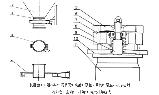 本機(jī)中與物料接觸的部分采用耐蝕不銹鋼材料。符合食品衛(wèi)生的要求。該機(jī)的工作是靠聯(lián)結(jié)在封閉電動(dòng)機(jī)不銹鋼套軸上的翼輪來(lái)達(dá)到混合的目的,并由不銹鋼彈簧、壓緊密封圈、密封圈等組成機(jī)械密封裝置,進(jìn)料斗與泵體用夾緊箍連接,電動(dòng)機(jī)與泵座用螺栓連接在機(jī)架上,整機(jī)可作任意移動(dòng),可以不用固定的安裝基礎(chǔ)。