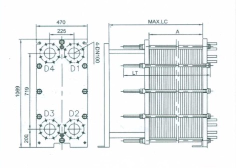 板式冷卻器是由固定擋板、板片、移動(dòng)擋板、立柱、上導(dǎo)軌、下導(dǎo)軌及固定螺栓組成。在固定擋板及移動(dòng)擋板之間是一系列被固定的板片。每片板片均有墊圈,所以板片間構(gòu)成相互平行的封閉流道,介質(zhì)在每兩塊板片之間交替流動(dòng)。
